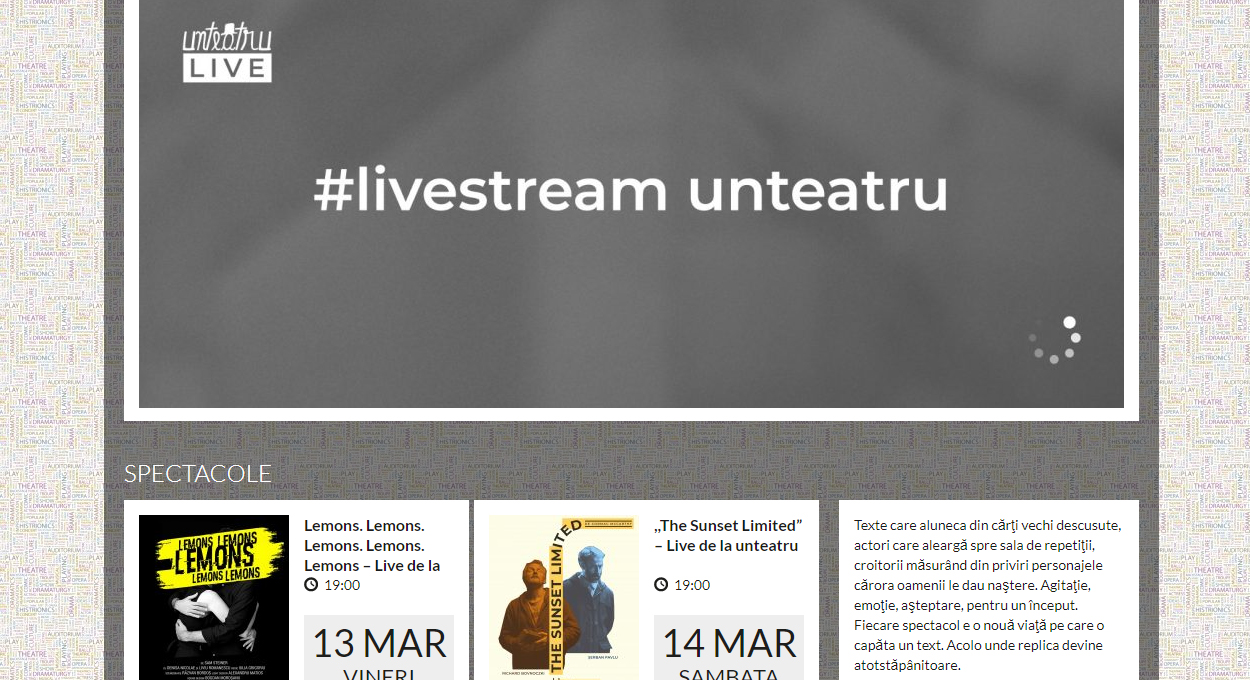 Va invit la teatru online, in fiecare zi, programul lor fiind si pentru elevi si pentru adulti. Programul si detaliile de vizionare: www.unteatru.ro.